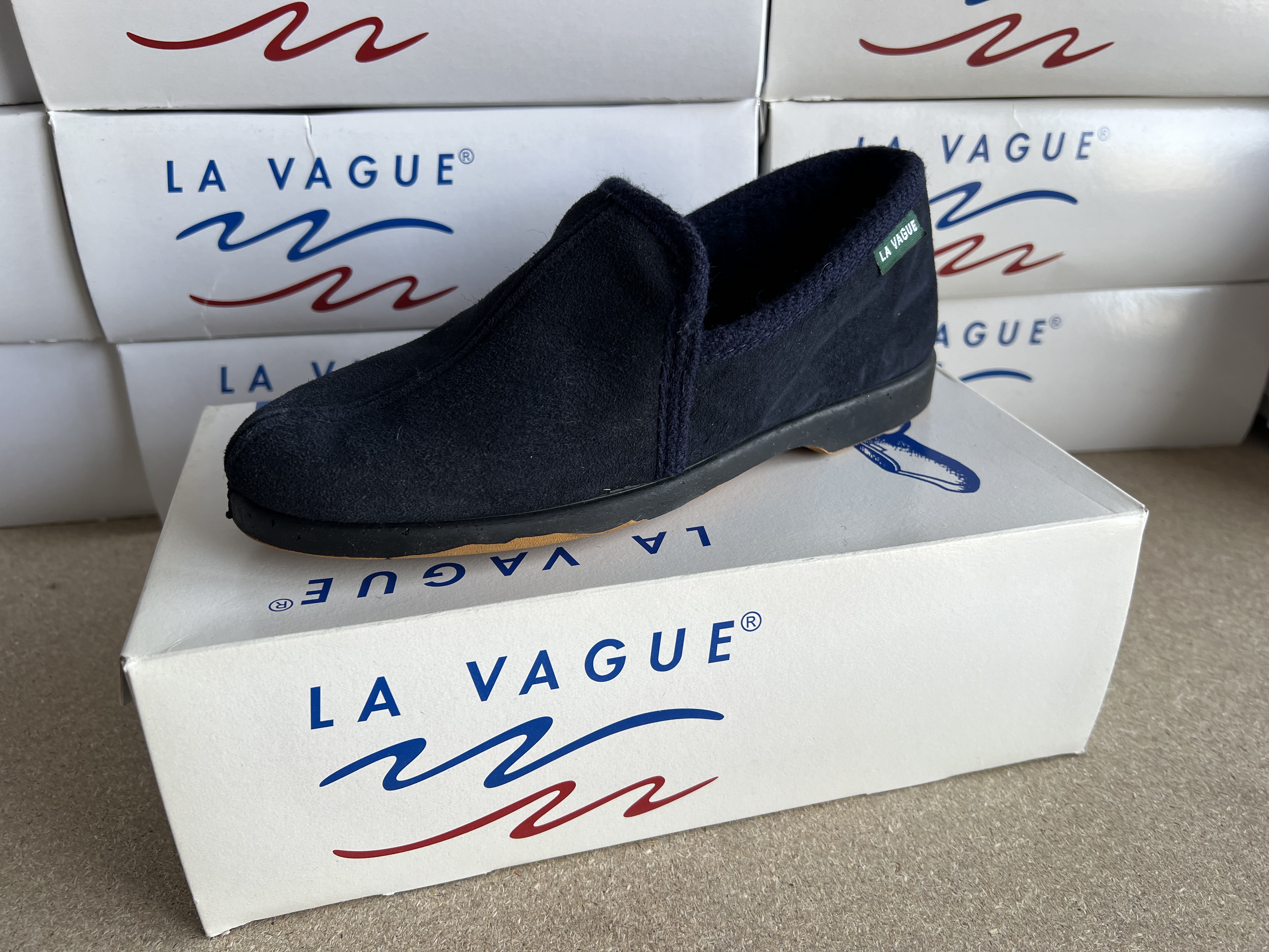 Mules bleues marine fourrés pure laine avec semelles en polymère rigide et résistant. Un de nos nombreux modèles pour passer l'hiver les pieds au chaud.Les chaussons de la marque LA VAGUE sont conçus...